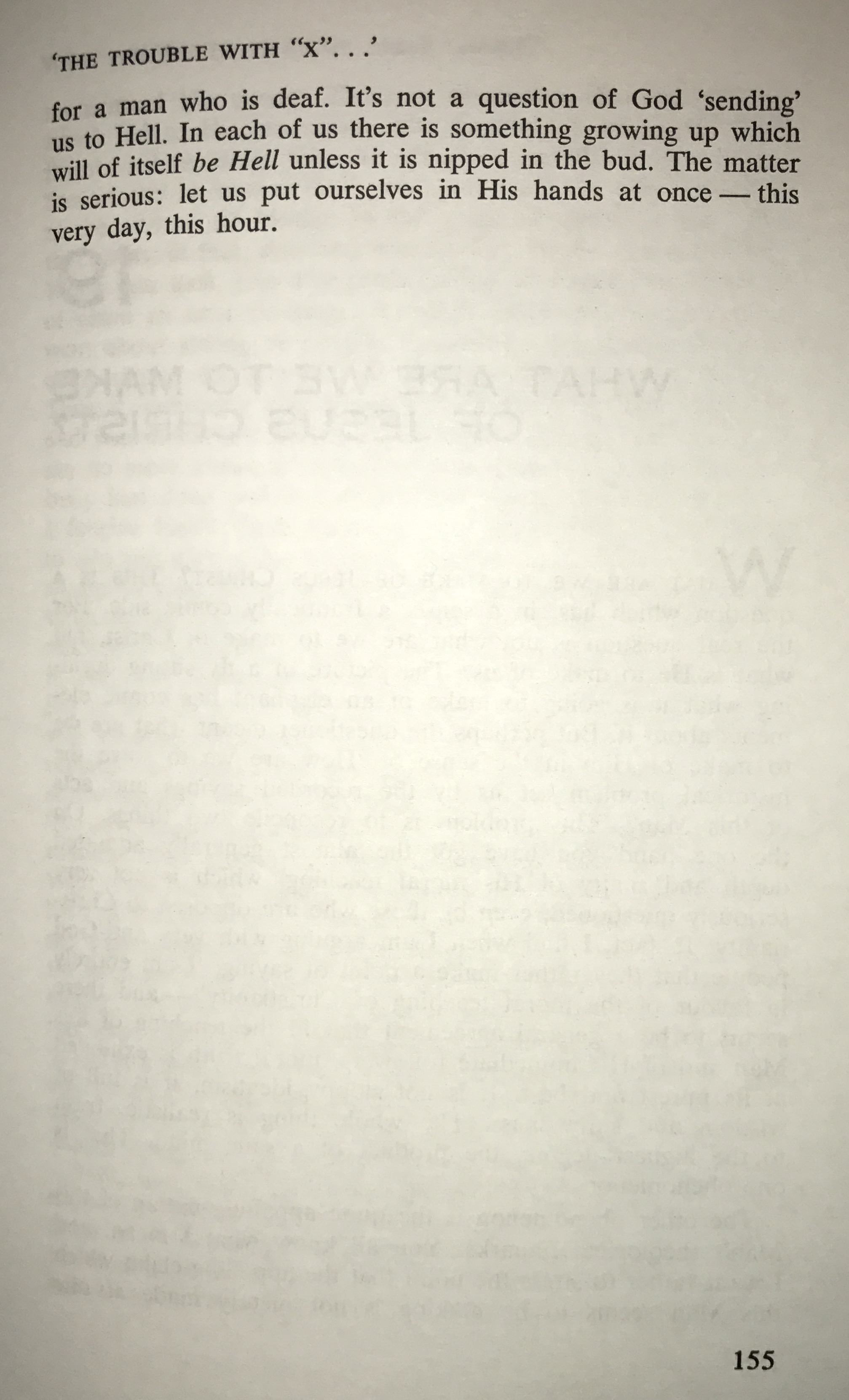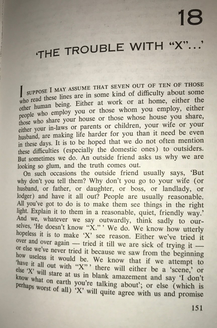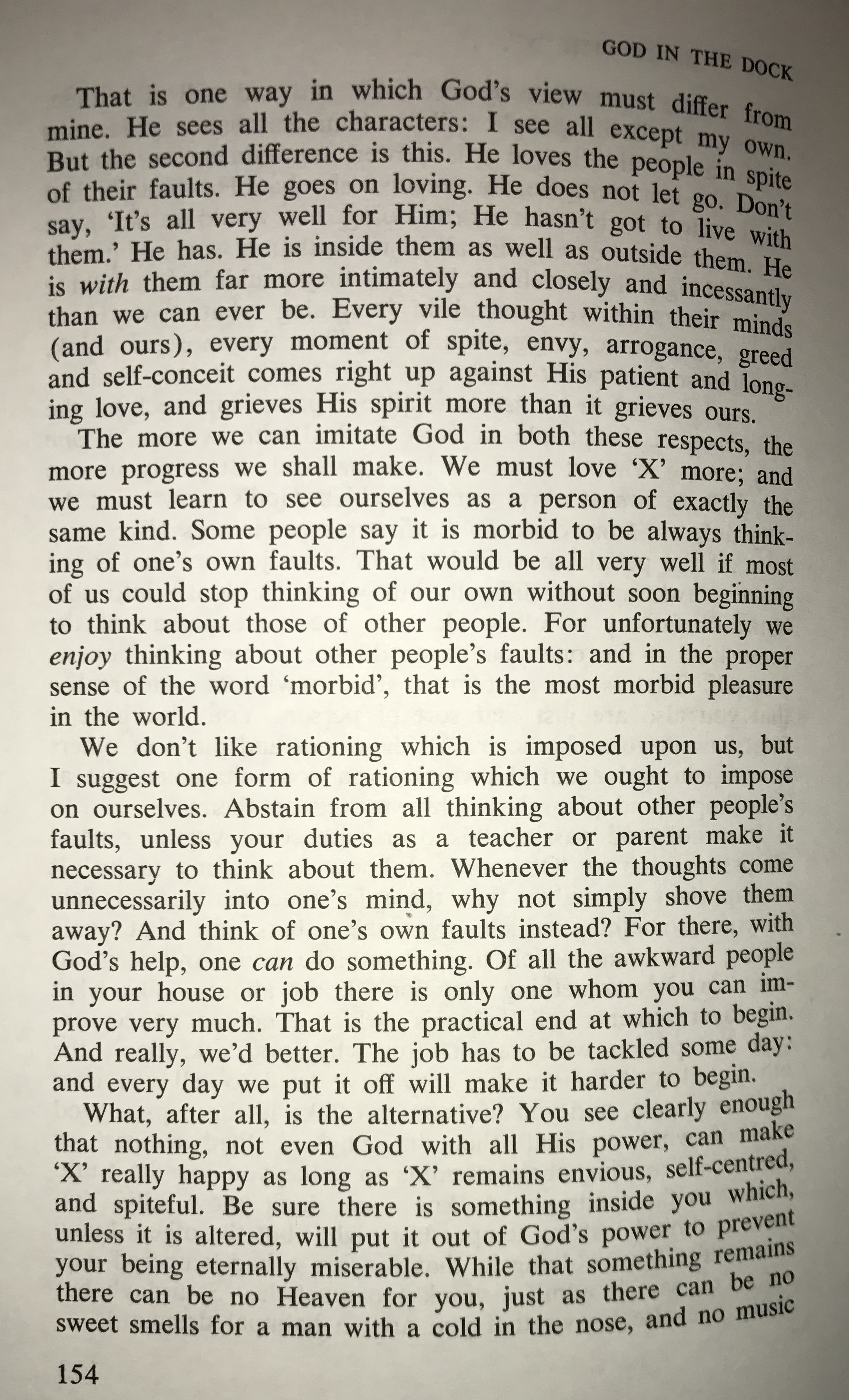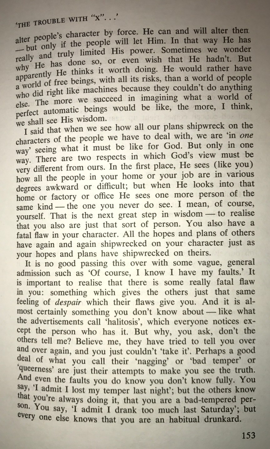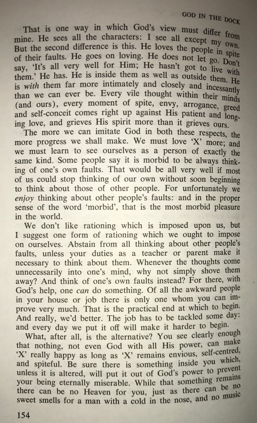 The reference for today’s devotional is from “God in the Dock-The Trouble with “X”” by C.S.Lewis. He explains that when all external factors are taken into account regarding happiness it all depends on the character of the other person whether it be a spouse, mate, family member, coworker, boss, landlord, cashier, pharmacist, physician, banker, etc…and then knowing you can’t nor have the power to alter the character of others. It is, or rather it seems easy to point out the flaws in the character of others, all the while ignoring and denying any and all faults of our own. The more we pursue to be more like God, imitating the character of God, we will recognize the pitfalls of judging the character of others because we are in the pursuit of being Christlike. Everyone you meet is fighting their own battles that we may never see, extend grace and mercy to them just as God gives both freely to you. Even in our darkest days we can be lifted up by God’s Everlasting love.