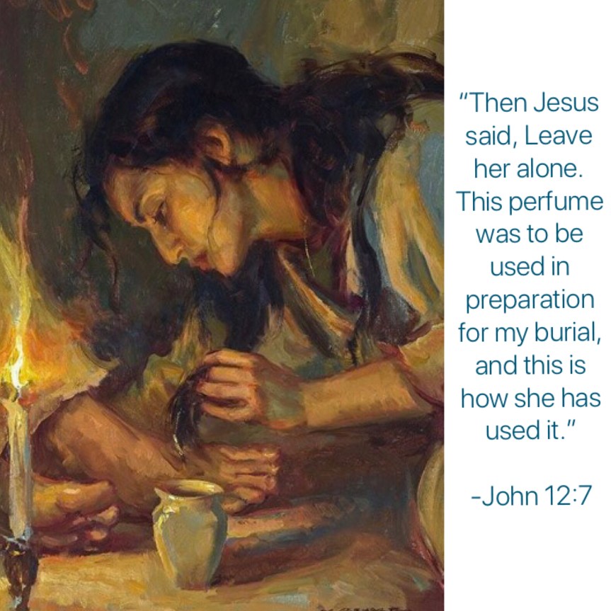 “Then Mary took an extraordinary amount, almost three-quarters of a pound, of very expensive perfume made of pure nard. She anointed Jesus’ feet with it, then wiped his feet dry with her hair. The house was filled with the aroma of the perfume. Judas Iscariot, one of his disciples (the one who was about to betray him), complained, “This perfume was worth a year’s wages! Why wasn’t it sold and the money given to the poor?” ( He said this not because he cared about the poor but because he was a thief. He carried the money bag and would take what was in it.) Then Jesus said, “Leave her alone. This perfume was to be used in preparation for my burial, and this is how she has used it. You will always have the poor among you, but you won’t always have me.” ~John 12:3-8