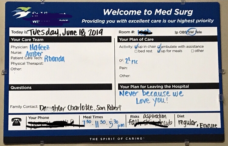 Monday was both long and frustrating for me and my family. We found out late in the afternoon that my dad may need to continue his physical therapy in a medical facility inside of going home. We are all disappointed but also appreciate the honest assessment of the situation. My dad is in good spirits and wants to do what’s recommended for his continued health and independence. He’s also evangelizing and reading his bible daily. What a witness for the Lord! The nursing staff and medical assistance all rave about how much they love him! And it just comes right out and ask, “Do you go to Church?” and “Are you saved?” What a blessing to have a faithful father and more importantly a faithful follower of Jesus! They love him so much in the hospital that on his whiteboard in his room under plan to go home says, “Never, because we love you!”