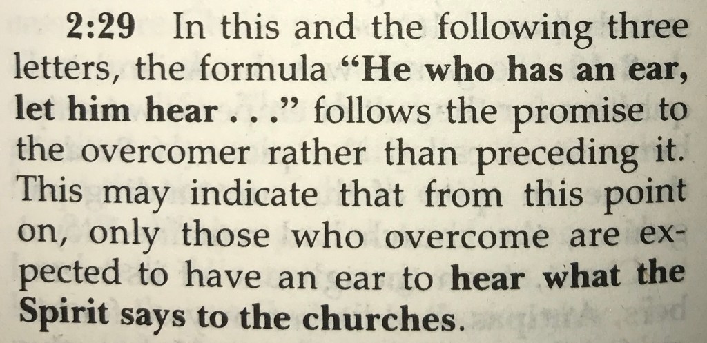Hearing, listening with our ears. Jesus says, “Let anyone with ears listen!” Ears unlike eyes do not have lids for closure. I personal think that was by design! Jesus was instructing the people to listen to the message of John the Baptist, John was fulfilling the prophecy of Elijah, and Jesus was indeed the Messiah. The verse in Revelation 2:29, heeds similar message to “anyone with ears listen to what the Spirit is saying to the churches.” I’ll be honest with you I have not studied Revelation enough to even try to explain the verse but I think the message is clear that we must listen to what the prophets said, the voices of God and Jesus and the spiritual guidance of the Holy Spirit. Below are photos of the verses in the Believer’s Bible Commentary. Thank you Carol & Mike, I cherish this wonderful gift.