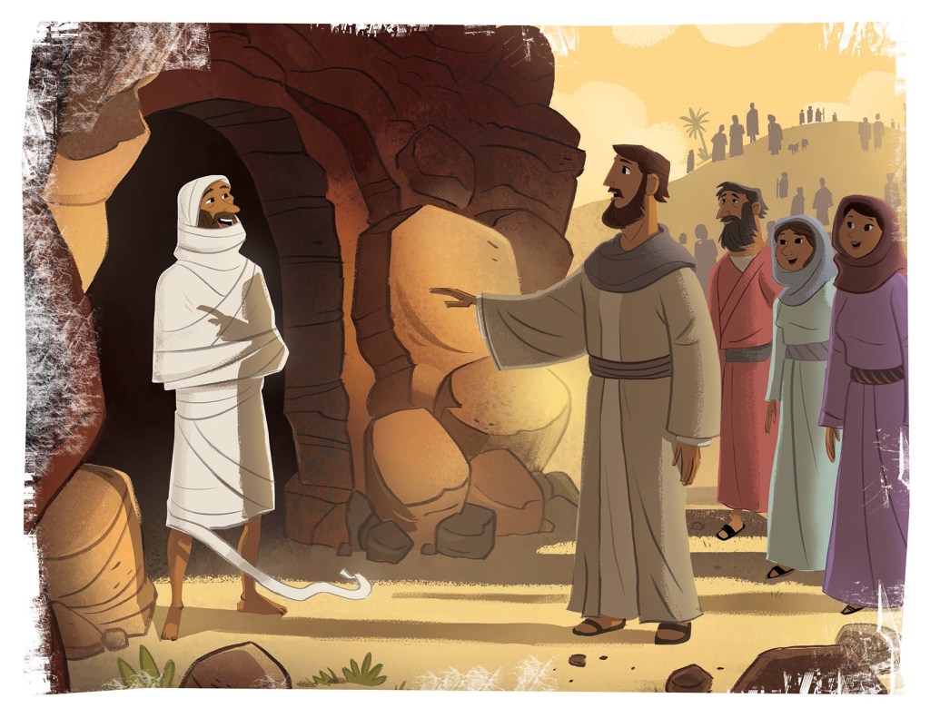 “When he had said this, he cried with a loud voice, “Lazarus, come out!” The dead man came out, his hands and feet bound with strips of cloth, and his face wrapped in a cloth. Jesus said to them, “Unbind him, and let him go.”