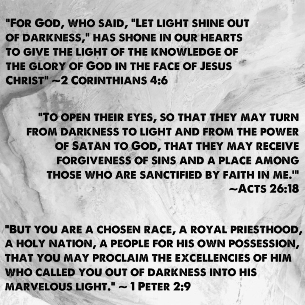 Everyday we have an opportunity to shine the light of Jesus in the corners of the world filled with darkness. The slightest ray of light will illuminate the dark, the darkness will never overcome the light. Showing kindness to someone will spark the light in their world.