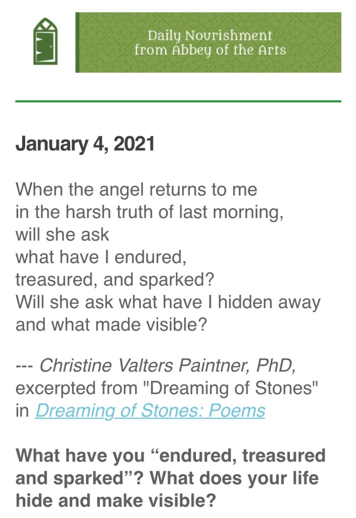 I wanted to share with you something I read today that caused me to pause and give thought. “Abbey of the Arts” is an email subscription I signed up for at the recommendation from a dear friend. It has brought much joy to me as well as opening up topics for theological discussions. In keeping with my theme of being a “Seeker of unexpected Comfort, Happiness, Joy and Patience and having tried my hand at writing some poetry myself, I was quite taken by this particular entry and poem. May it bless you as it has me.