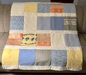 Lastly, I wanted to share my “blanket story” it is a blanket my aunt and cousin had made for me. It contains clothing my mom had worn to work and around the house. When I look at it I see more than a blanket, it’s a story of my mom. A tapestry of woven common cloths that I had previously seen my mom wearing. What a priceless gift given out of love. My mom passed away over ten years ago but she lives on in my memories and in every beat of my heart. She carried me, taught me, supported me, worried over me, and congratulated me on every success. She was my cheerleader in life and these memories as well as my blanket keep me warm and protected. My mom was a gift, God knew I needed her wisdom to prepare me for life.